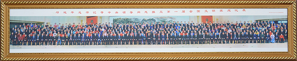 首届“全国文明家庭”代表合影照片。(第一排左起第33位是习近平总书记,第四排左起第40位是刘萍。记者 汤波 翻拍)