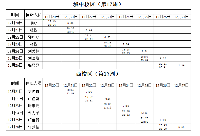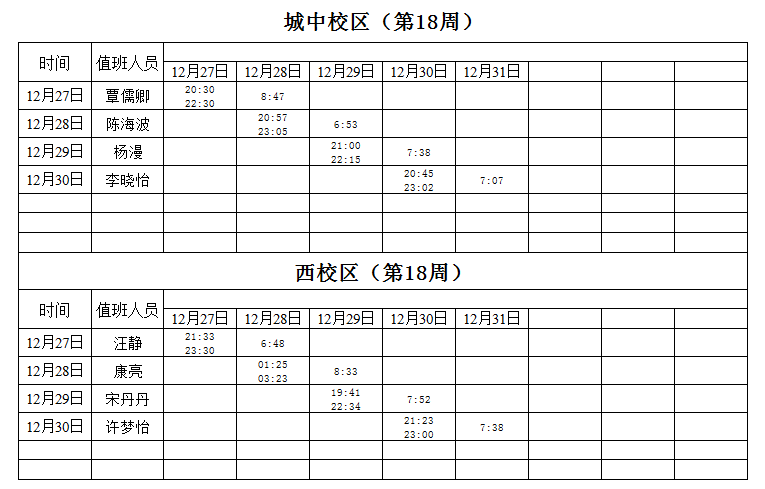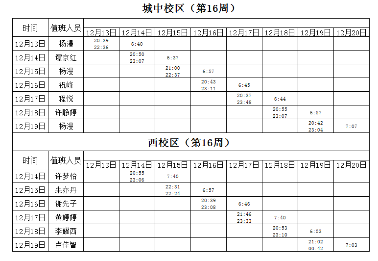 2021-2022学年第1学期第16-18周学工人员寝室值班通报