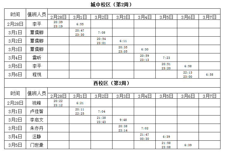2021-2022学年第2学期第1-2周学工人员寝室值班通报