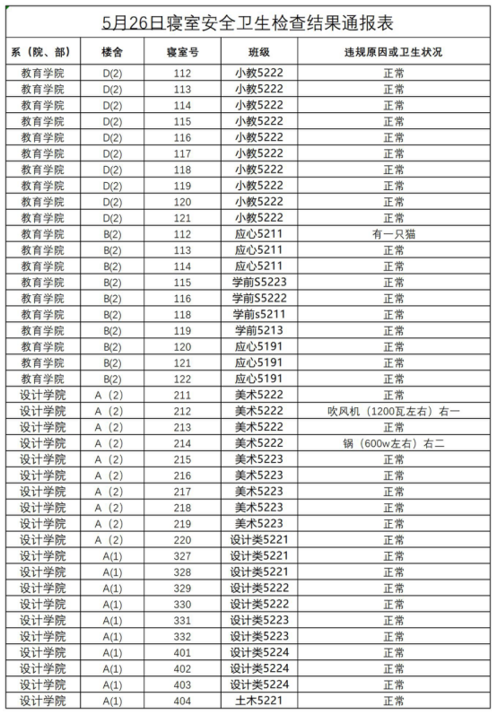 2022-2023学年第二学期第十五周寝室安全卫生检查结果通报