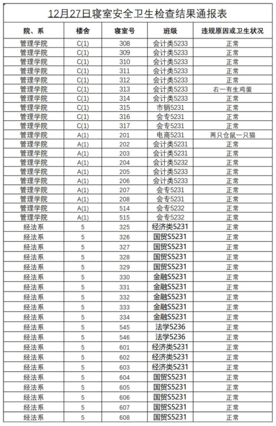 2023-2024学年第一学期第十八周寝室安全卫生检查结果通报
