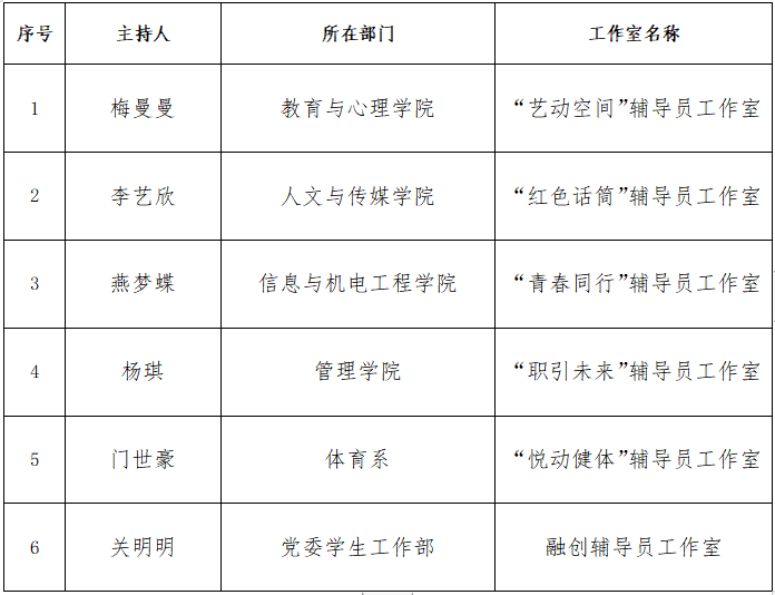 按照《关于申报伟德国际1946源于英国“两康一训”首批辅导员工作室的通知》,学校于2023年12月4日启动了首批辅导员工作室的申报工作。经团队申报、资格初审、专家评议、学校终审,确定6个工作室为2024年首批校级工作室建设项目并予以资助。现将首批辅导员工作室名单予以公布。