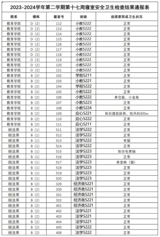 2023-2024学年第二学期第十七周寝室安全卫生检查结果通报