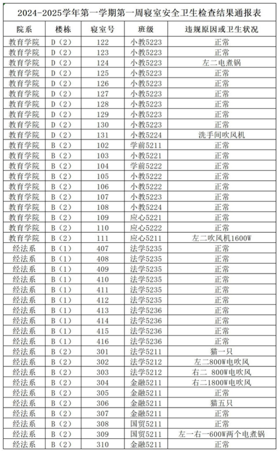 2024-2025学年第一学期第一周寝室安全卫生检查结果通报