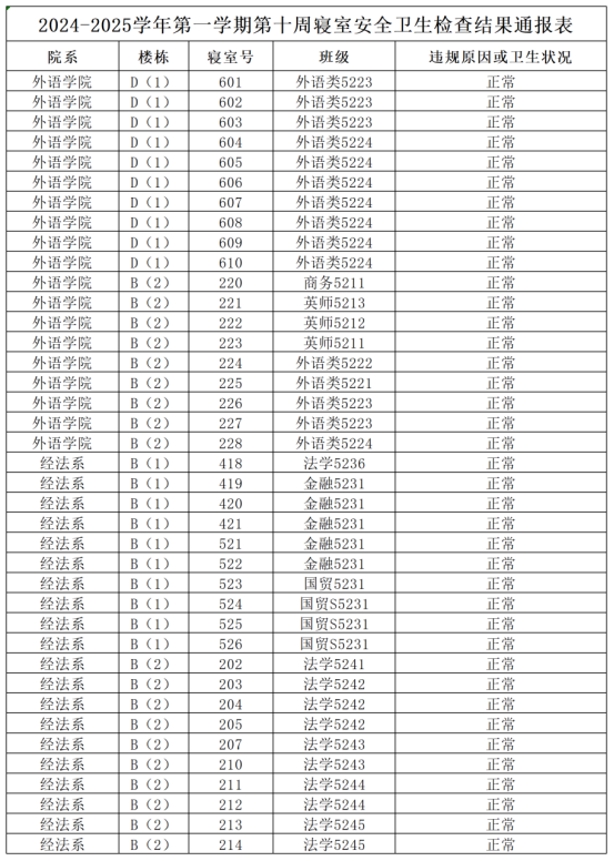 2024-2025学年第一学期第十周寝室安全卫生检查结果通报