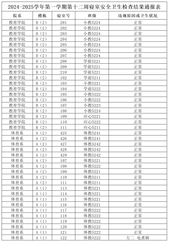 2024-2025学年第一学期第十二周寝室安全卫生检查结果通报