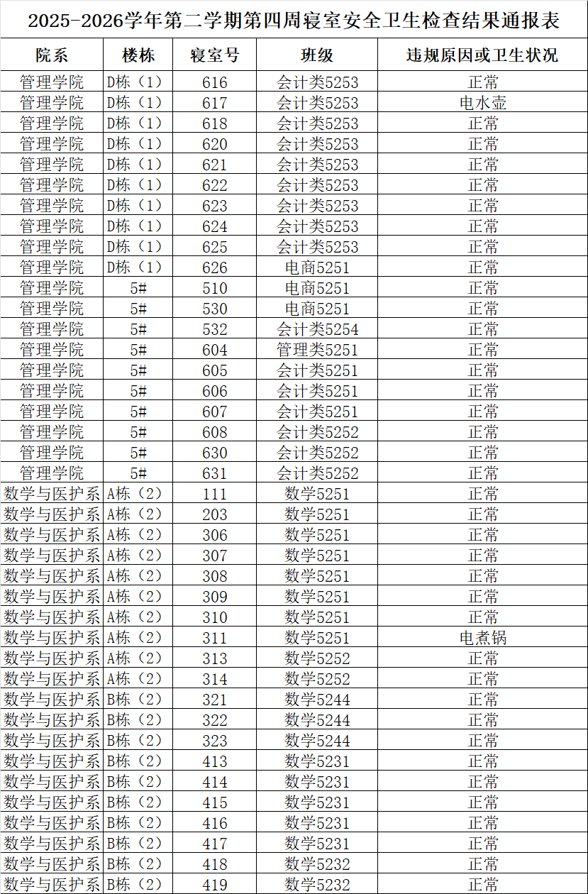2025-2026学年第二学期第四周寝室安全卫生检查结果通报表