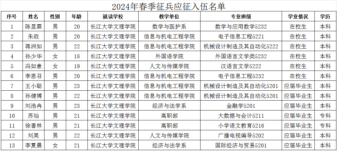 通过荆州区武装部组织的体检、政审考核、心理测试、役前训练等环节,我校陈昱霖等13名同学经湖北省荆州市荆州区人民政府征兵办公室批准光荣入伍,现根据相关规定予以公示,公示时间为2024年3月20日至3月25日。如有异议,请在公示期内向学院纪检监察部或荆州区武装部进行反映。