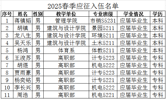 通过荆州区武装部组织的体检、政审考核、役前适应性测试、役前训练等环节,公司蒋镇韬等11名同学经湖北省荆州市荆州区人民政府征兵办公室批准光荣入伍,现根据相关规定予以公示,公示时间为2025年3月10日至3月15日。如有异议,请在公示期内向学院纪检监察部或荆州区武装部进行反映。