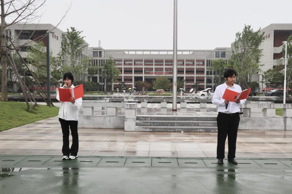 在细雨中,国旗护卫队昂首阔步,动作整齐划一,随着国歌的奏起,五星红旗缓缓上升,迎风飘扬。接着,员工代表范怡然、朱颖在国旗下朗诵《百年芳华》,其中提到的“红船精神〞和“长征精神”贯穿了中国共产党百年奋斗历程,也是我们党的强大精神力量和宝贵精神财富。当代青年不仅要勇于担当使命,更要彰显为国为民的情怀,要敢于无畏前行,善于开拓创新,以科技报国的责任和担当各展所长,在国家发展历程中实现人生理想。