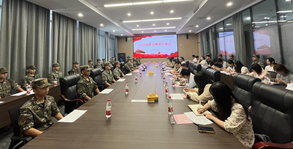 9月8日下午,在图书馆512会议室举行2024级本、专科新生军训教官见面会。学校领导公司党委副书记李则俊,党委员工工作部部长李刚英、副部长王琳,武警荆州支队作训参谋王浩、队管参谋刘畅,全体带训教官、新生辅导员、员工工作部相关工作人员参加会议。