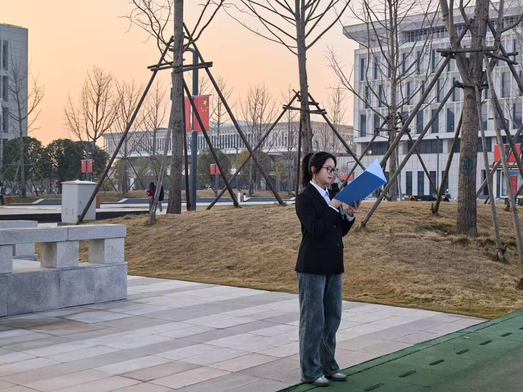 仪式开始,主持人吴潇堉宣布开场,护旗队员迈着矫健的步伐将国旗护送至旗杆下。国旗缓缓升起,全体师生行注目礼,展现爱国之情。