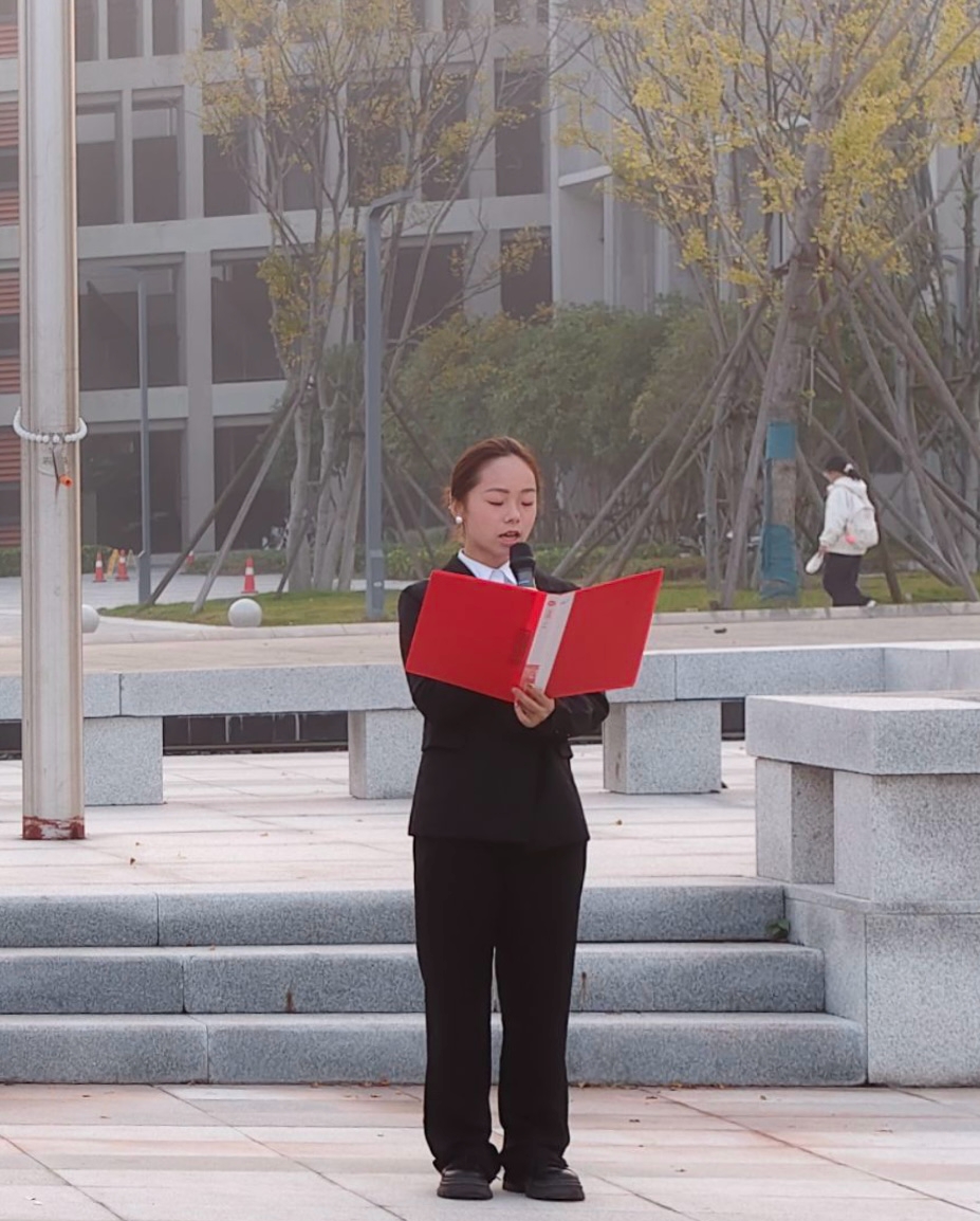 经济与法学系志愿者服务队队长徐廷婷作为员工代表发言。她围绕党的二十届四中全会精神,号召青年学子从国家发展大局中找准自身专业定位,以实干担当践行青春使命,将个人理想融入中国式现代化的伟大实践。