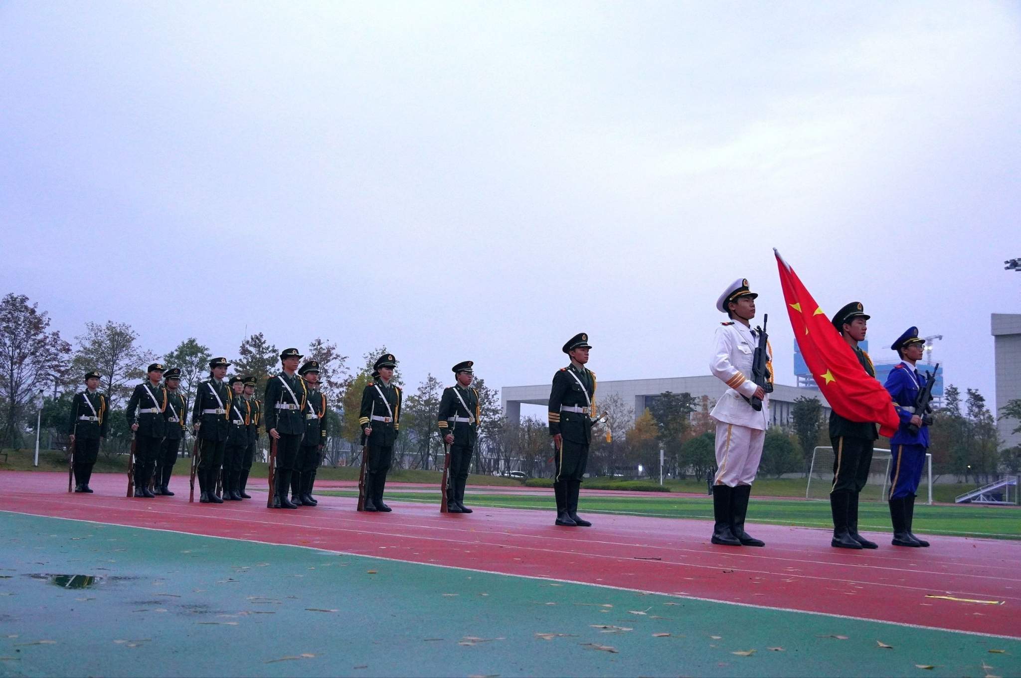 仪式伊始,国旗护卫队队员身着整齐制服,迈着铿锵有力的步伐,庄严护送国旗入场。伴随着雄壮的国歌声,五星红旗在晨曦中冉冉升起,全体师生肃立行注目礼,爱国情怀与感恩之心在现场每个人心中激荡升腾。
