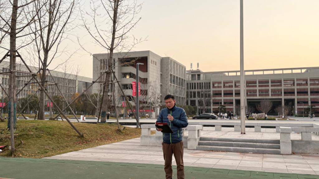 升旗仪式结束后,员工代表胡弈承以“体育精神与强国使命”为主题发表国旗下讲话。他号召全体体育学子牢记使命担当,将个人理想融入国家发展大局,以奋勇拼搏为笔,以坚韧不拔为墨,在体育道路上勇攀高峰,用实际行动书写爱国华章,让体育精神成为青春最亮丽的底色。