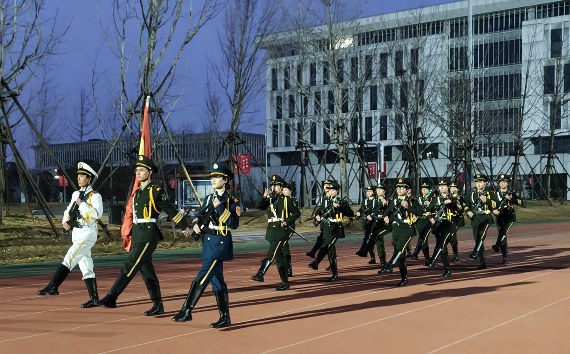 国旗护卫队迈着整齐划一的步伐,昂首挺胸护送五星红旗入场。在全场师生的注目下,五星红旗冉冉升起,迎风飘扬。全体人员肃立致敬,齐唱国歌,爱国之情与奋斗之志在每个人心中激荡。