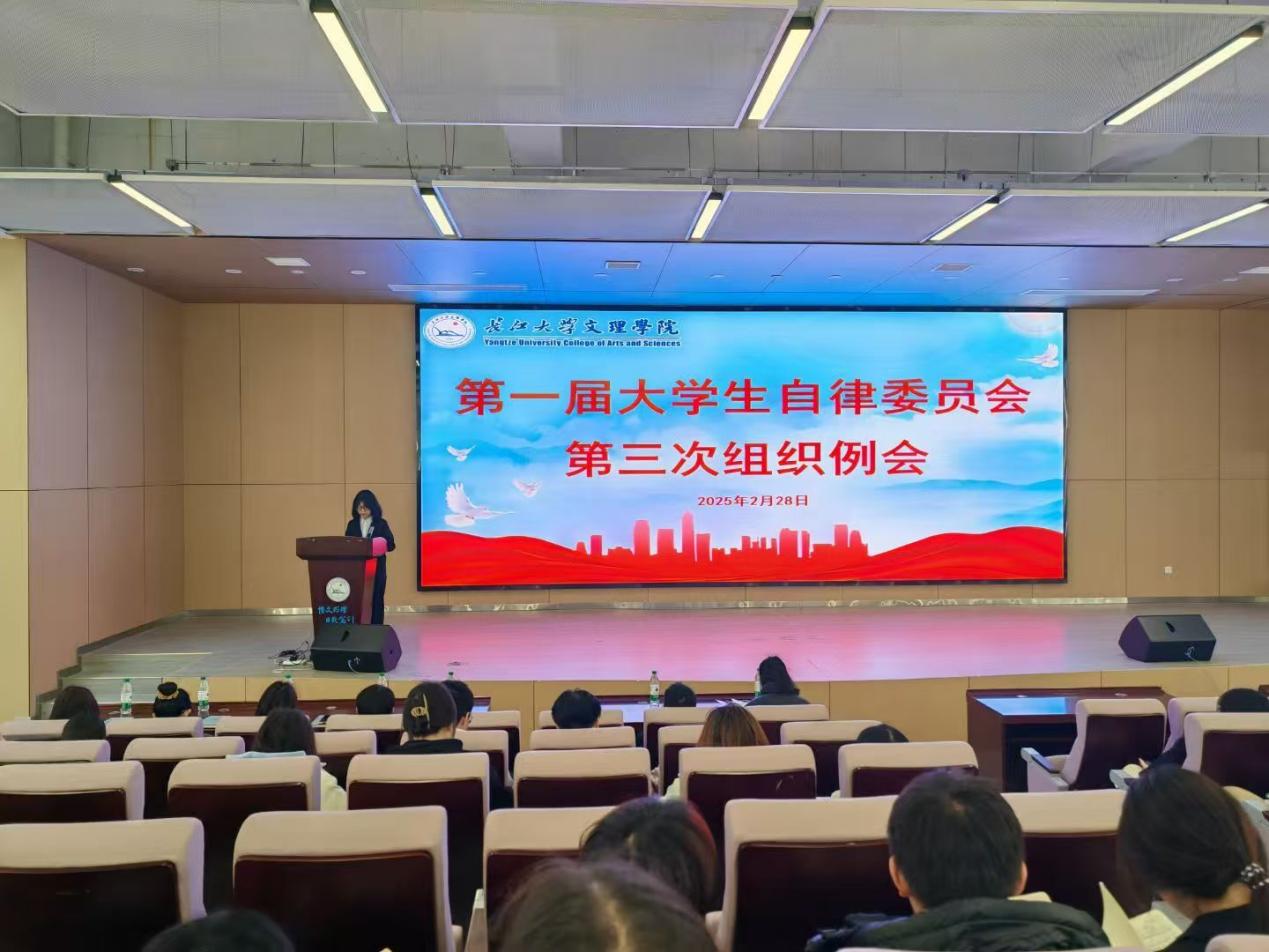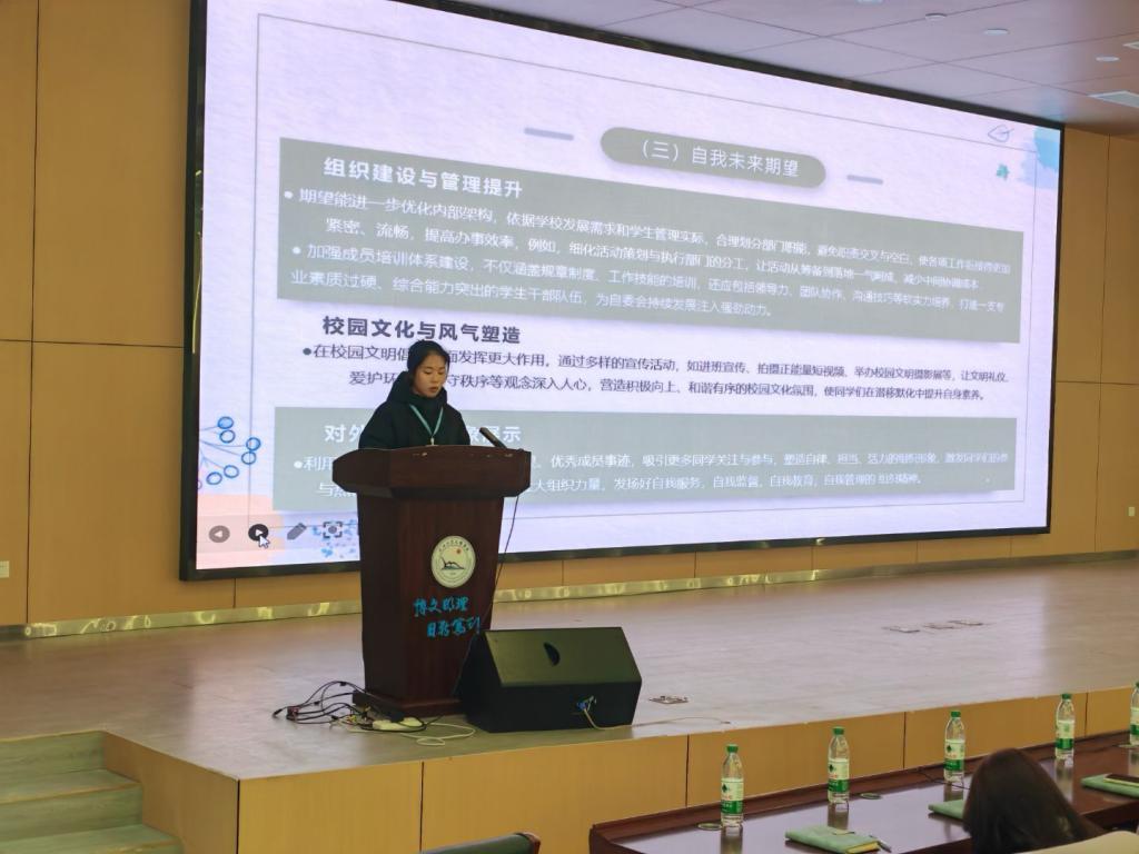 大会第二项,由主席团代表杨萌萌进行发言。她对过往工作进行了简要回顾,肯定了成员们在校园秩序维护、学风建设监督等方面取得的成绩,同时也指出存在的不足,如部分活动宣传力度不够、考勤方面与各班级沟通协作有待加强等问题。