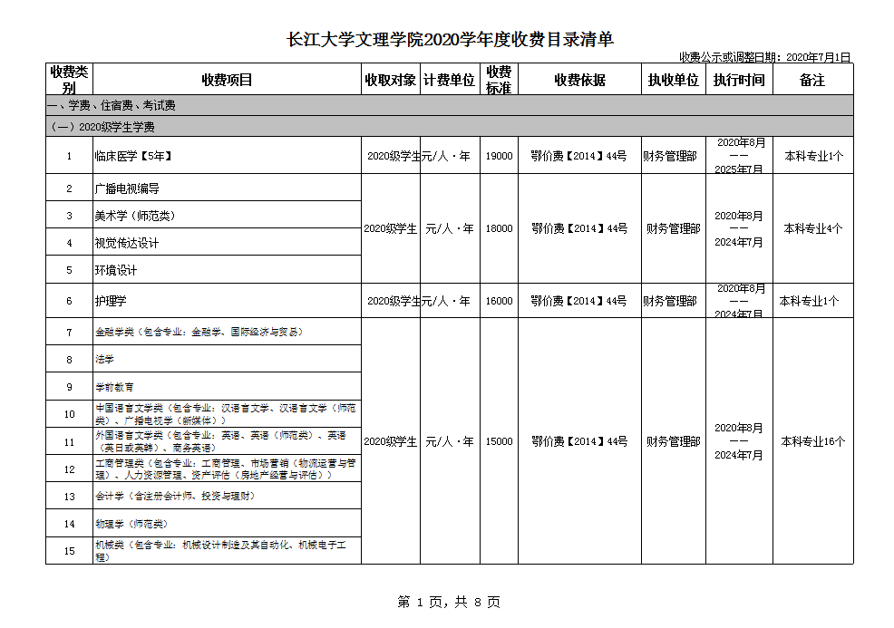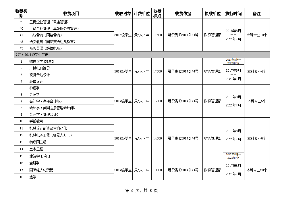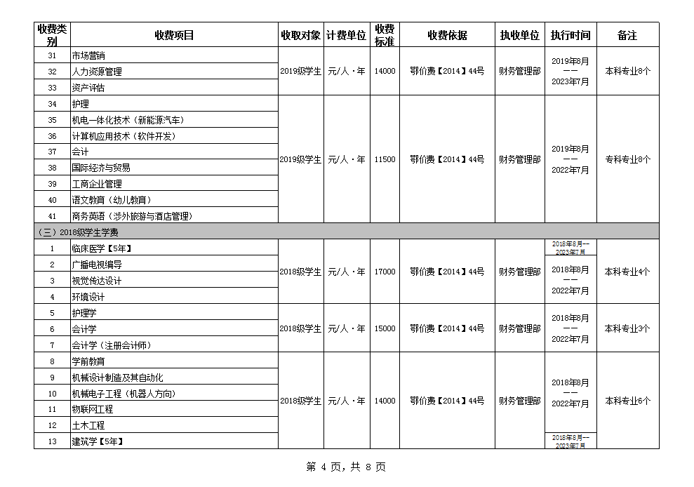 根据省教育厅、省物价局《关于我省民办普通高等学校学费标准备案及有关问题的通知》(鄂价费(2016)63号文)的文件精神,现将公司2020年收费目录清单公布如下: