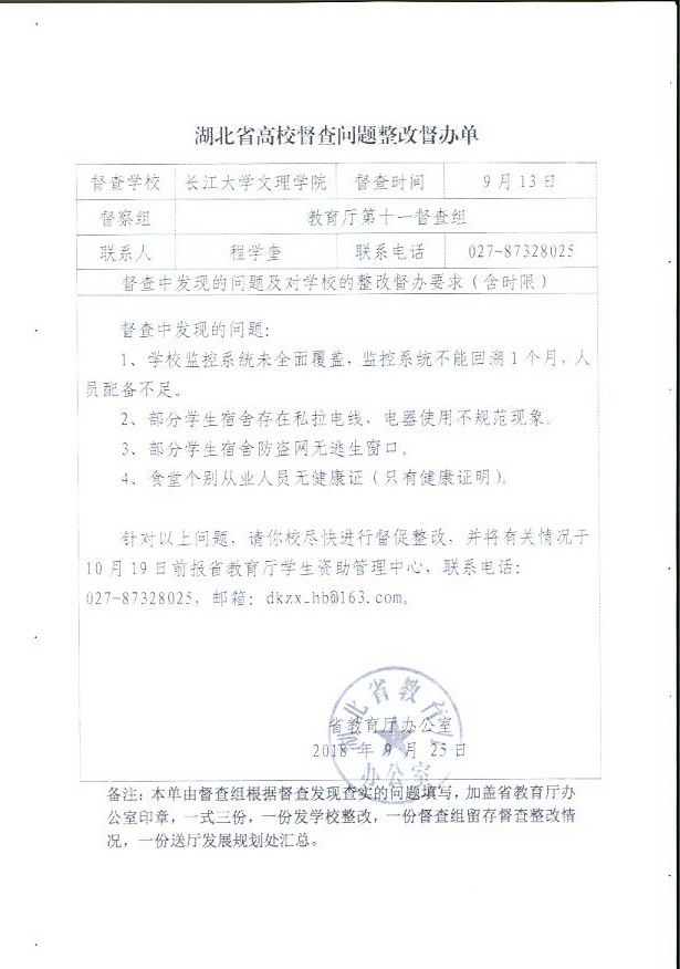 2018秋季湖北省高校督查问题整改督办单