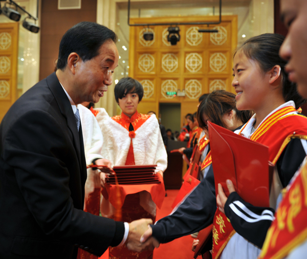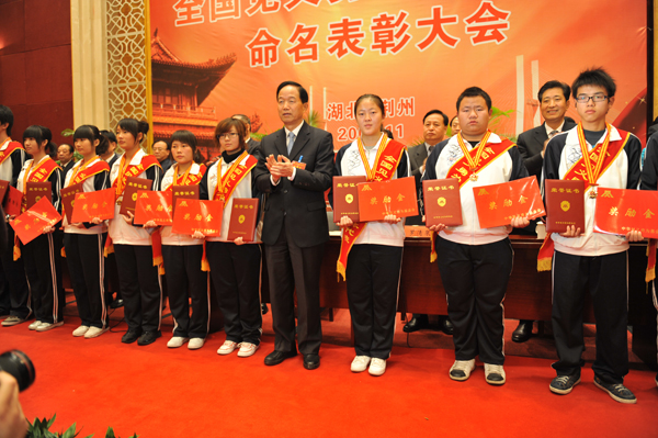 贾春旺为“全国见义勇为英雄群体”授牌、颁奖;罗清泉、李鸿忠等为“湖北省见义勇为英雄群体”授牌、颁发证书。