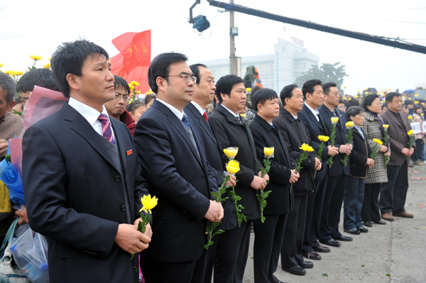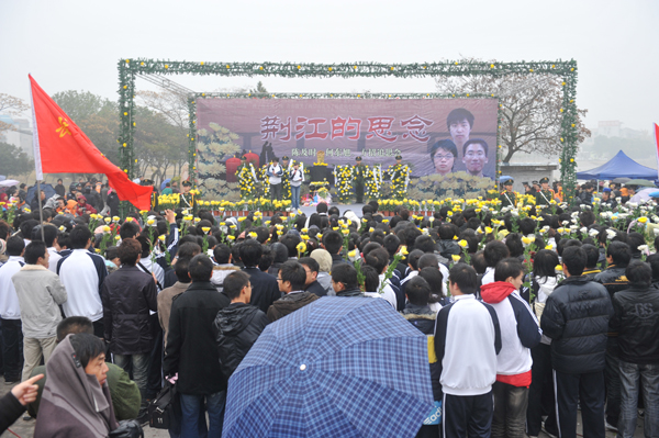 下午2点半,中华见义勇为基金会理事长贾春旺一行来到荆江宝塔湾,看望慰问了正在这里追思陈及时、何东旭、方招的英雄亲属和长大英雄学子。“感谢您为社会培养了一个好儿子!”贾春旺紧紧地握住三位英雄家属的手,并向其他15位英雄表示慰问。“向英雄默哀!”下午2时40分,在三位英雄的巨幅照片前,追思仪式正式开始。贾春旺、吴永文等与数千民众一道,手捧黄菊花向烈士肃立默哀。随后,贾春旺一行分别上台,向三位英雄的遗像敬献了黄菊花。