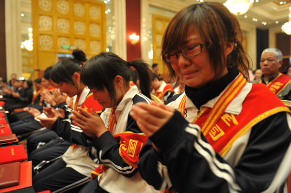 在命名表彰会上,何东旭的母亲杨清珍眼含热泪,向参加会议的全体人员五次鞠躬,作为烈士家属代表,10多分钟的发言对这位母亲而言显得那么漫长。一句句饱含爱意的话语,令在场的每一个人动容,许多听众忍不住拿起手上的纸巾,擦拭眼角感动的泪水。“10月24日,陈及时忘记了妈妈‘好好照顾自己’的再三叮嘱,何东旭忘了自己刚刚做完手术,方招忘了妈妈‘不要近水’的‘禁令’,但他们都没有忘记老师教过他们要‘助人为乐’,没有忘记当代青年担当的时代责任……当妈妈们知道你们出事的那一刻,我们的心脏几乎停止了跳动,但是我们真切地看到了儿子们身上闪亮的光芒。”“孩子们今天的光荣不仅属于我们家属,更属于整个社会。”鞠躬、鞠躬、再次鞠躬……杨清珍用五次鞠躬表达了对党和政府,对社会各界的感激之情。泪水早就模糊了这位母亲的双眼,也尽情流淌在与会者的脸庞上。