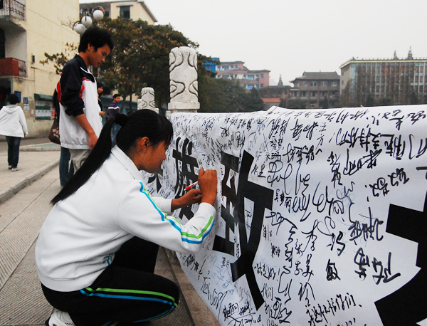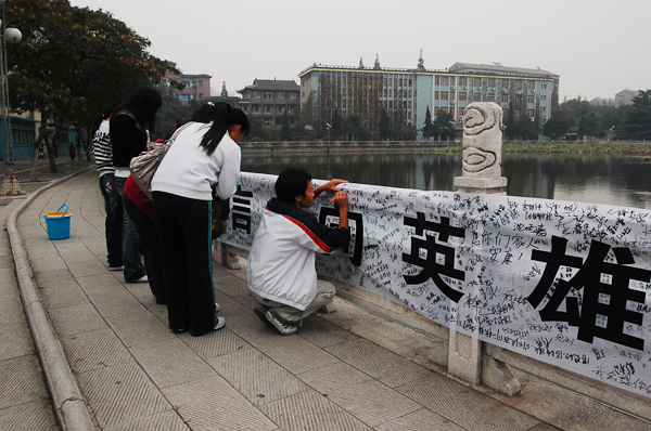 中午放学,这条横幅吸引了近千名学子前来围观,不时有同学拿着相机拍下各种美好的祝福。当刘露同学经过时,她掏出了手中笔在横幅上填上了“刘露,祝你们一路走好!”的这一句简单而又美好的祝福。她告诉记者,由于之前她没有和别人一起在横幅上留下自己对英雄的祝福,今天刚好看到了,一定要补上,为英雄祈祷,也算上我一个。